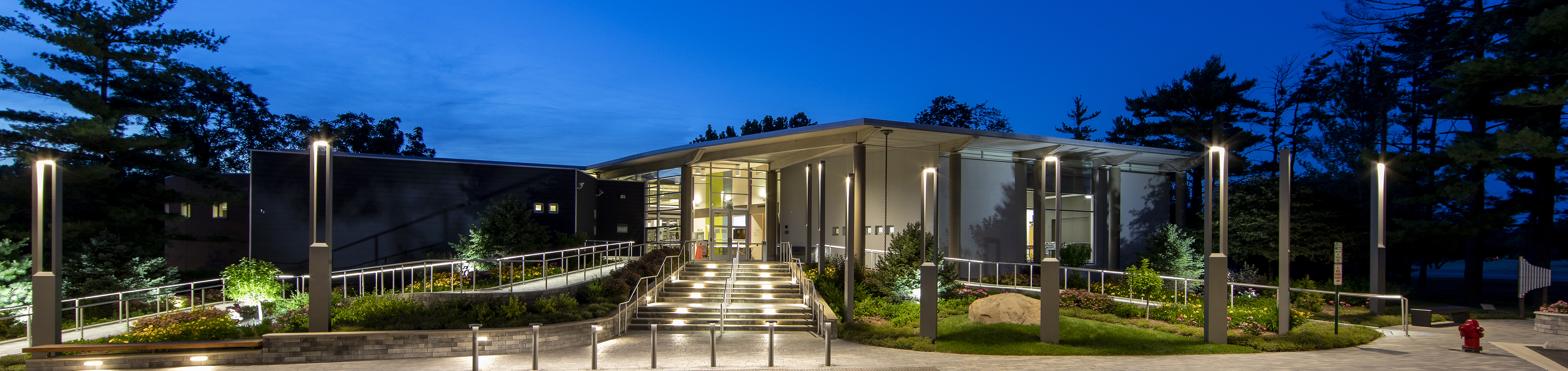 Exterior photo of library entrance at dusk