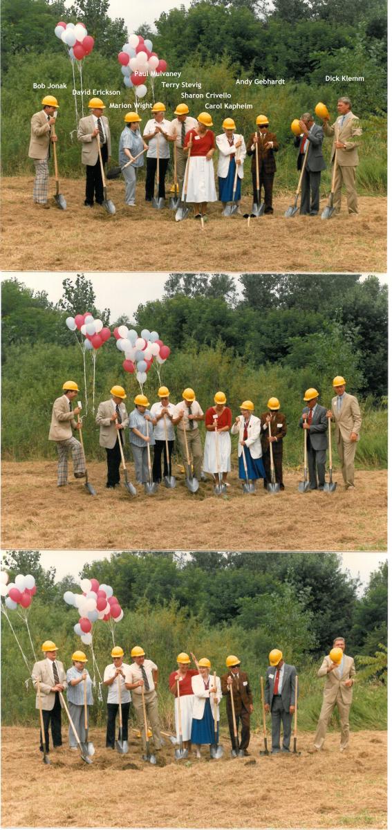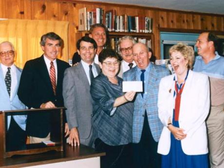 Library trustees receiving the Build Illinois grant check in July, 1986 at the Osage Street library, pictured left to right: Paul Mulvaney, Secretary of State and State Librarian Jim Edgar, Board President Robert Jonak, State Senator Richard "Dick" Klemm, Marion Wight, Head Librarian David Erickson, Andy Gebhardt, Carol Kapheim, and Terry Stevig. Trustee Sharon Crivello not pictured here.