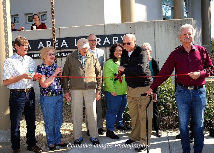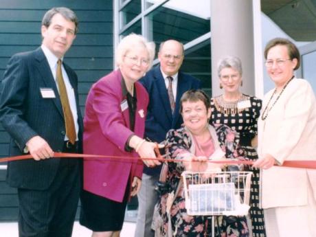 Library trustees cut the ribbon at the library's Grand Opening, September 28, 1997. Pictured left to right: Bob Jonak, Carol Kapheim, Terry Stevig, Joanne Miller, Kathie Carr, and Peggy Whitman.