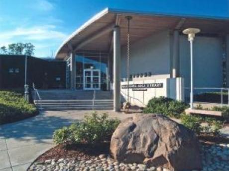 Outside original library building 801 N. Main Street. 09/19/1987 - Library building Grand Opening